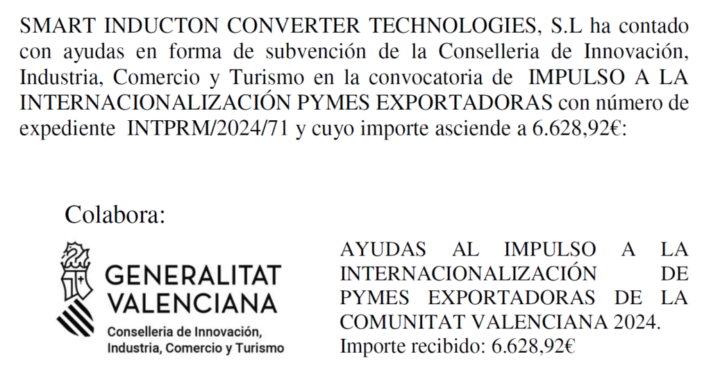 SMART INDUCTON CONVERTER TECHNOLOGIES, S.L ha contado con ayudas en forma de subvención de la Conselleria de Innovación, Industria, Comercio y Turismo en la convocatoria de IMPULSO A LA INTERNACIONALIZACIÓN PYMES EXPORTADORAS con número de expediente INTPRM/2024/71 y cuyo importe asciende a 6.628,92€.